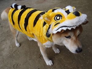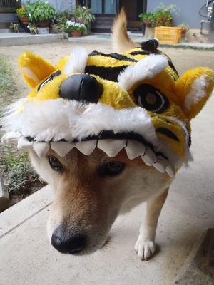 「寅の被り物」を被っている、うちのワンコ『てっちゃん』