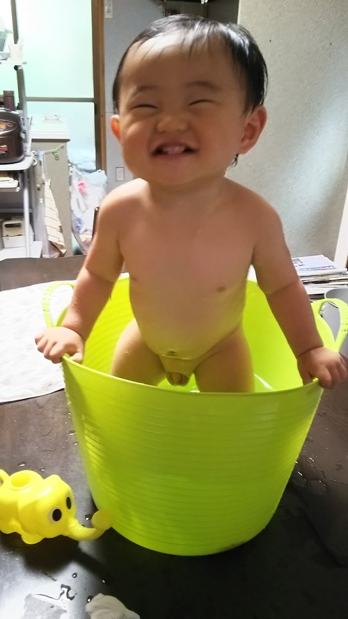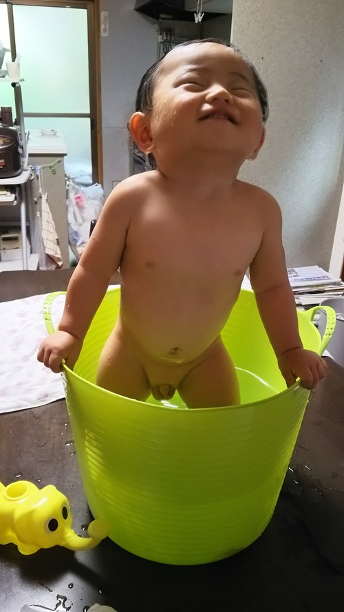 我が家の王子様、日課の『朝風呂』シーンです(^^)一人でタッチ出来るようになりました!