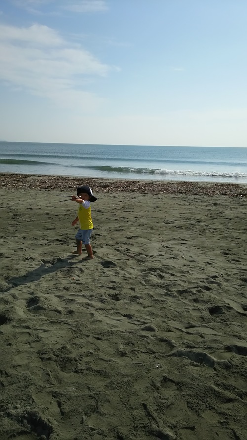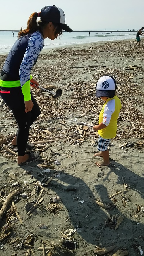 我が家の王子様、『ビーチクリーン』に参加しました\(^-^)/火箸を持って、頑張りました!