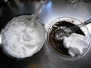 チョコレートを混ぜた生地と、卵白をしっかり泡立てて、混ぜます。