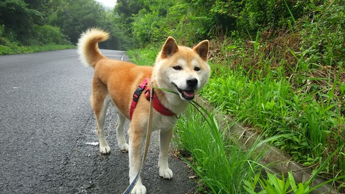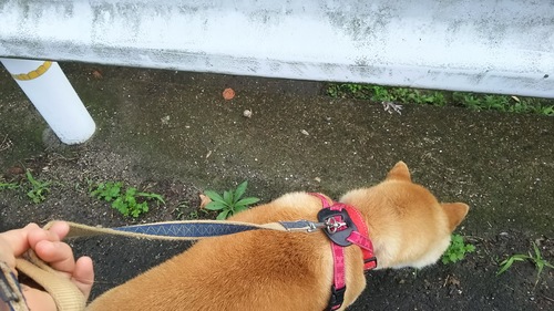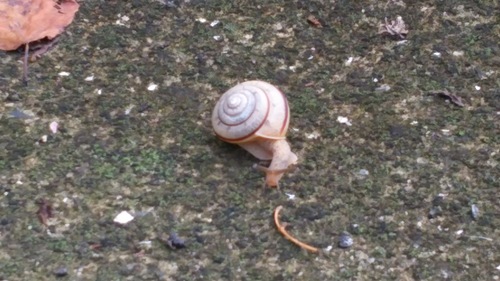 梅雨らしいお天気(^_^;)夕方の散歩で、カタツムリを見つけました‼『鉄』の目にはとまらない様子です\(^_^)/