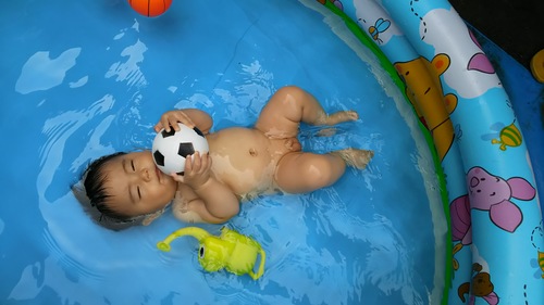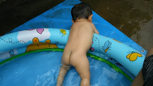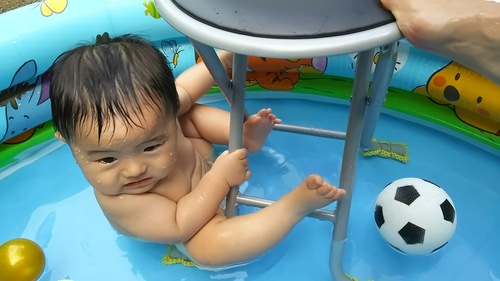 我が家の王様、庭プールが日課となってます(^^)彼の最近の流行りは、プールの外での水遊びと、仰向けのボール遊び!そして、私の座っている椅子にしがみついたり・・・自分で遊び方を、見つけてきます。赤ちゃんのパワーはすごい‼毎日の成長に驚かされます(^o^)v