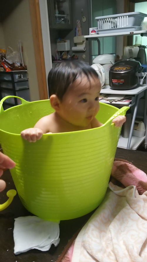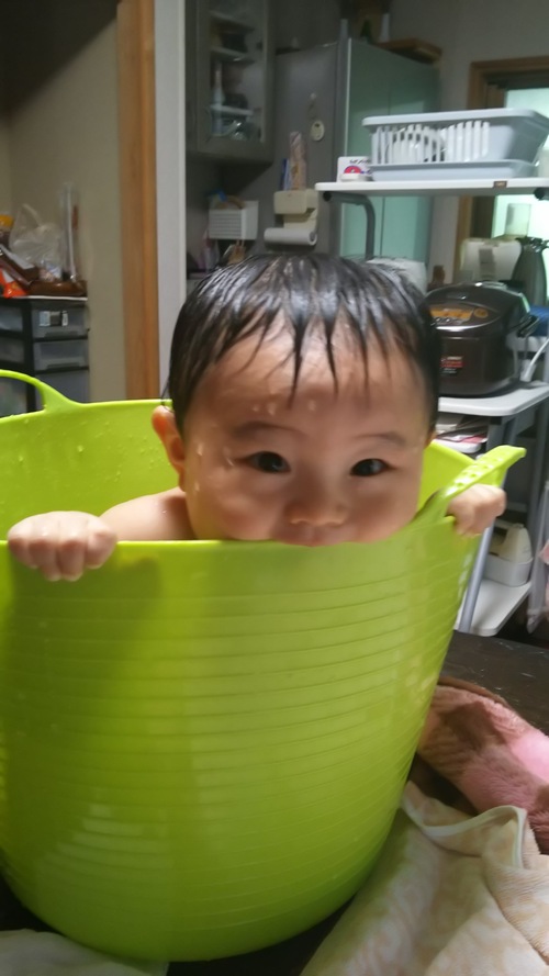 朝の着替える前に、日課のの『バケツ浴』です\(^_^)/だんだん、バケツでは狭くなってきました(^^)我が家の王様は、お水の中は、いっつも、ご機嫌さんです(^o^)v
