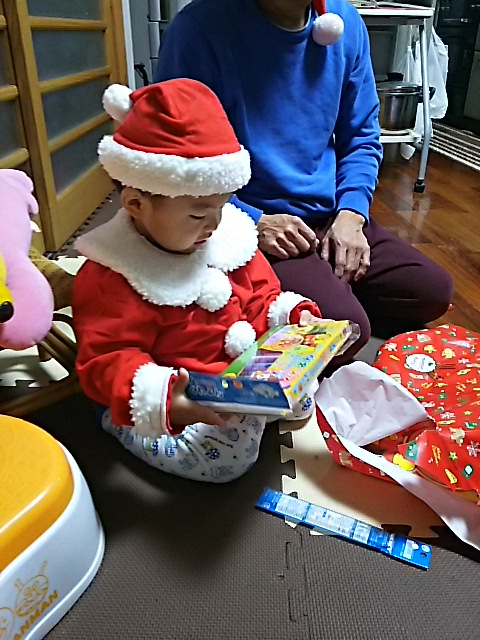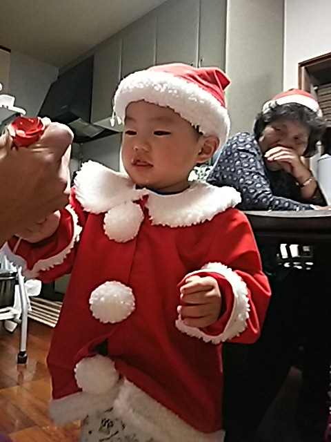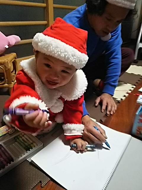 我が家の王子様、『サンタクロース』の衣装を着てみました!普段は嫌がる帽子もかぶってくれました(^^)アンパンマンのクレヨン、気に入ったようです(^-^)/
