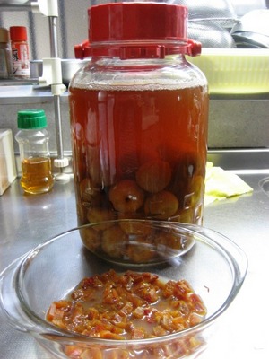 あちゃら漬けを作ってみます。自家製の梅酢と、お正月のお飾りの干し柿が材料です。
