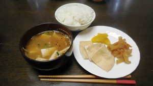 3週間、日本食が恋しくて・・・・、昼ごはんはシンプルに、ご飯・お味噌汁・沢庵・煮物を頂きました\(^o^)/