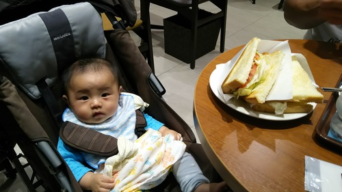 我が家の王様、初めてのカフェ(^o^)vベビーカーで、行けました!久しぶりに、主人とデートでした‼